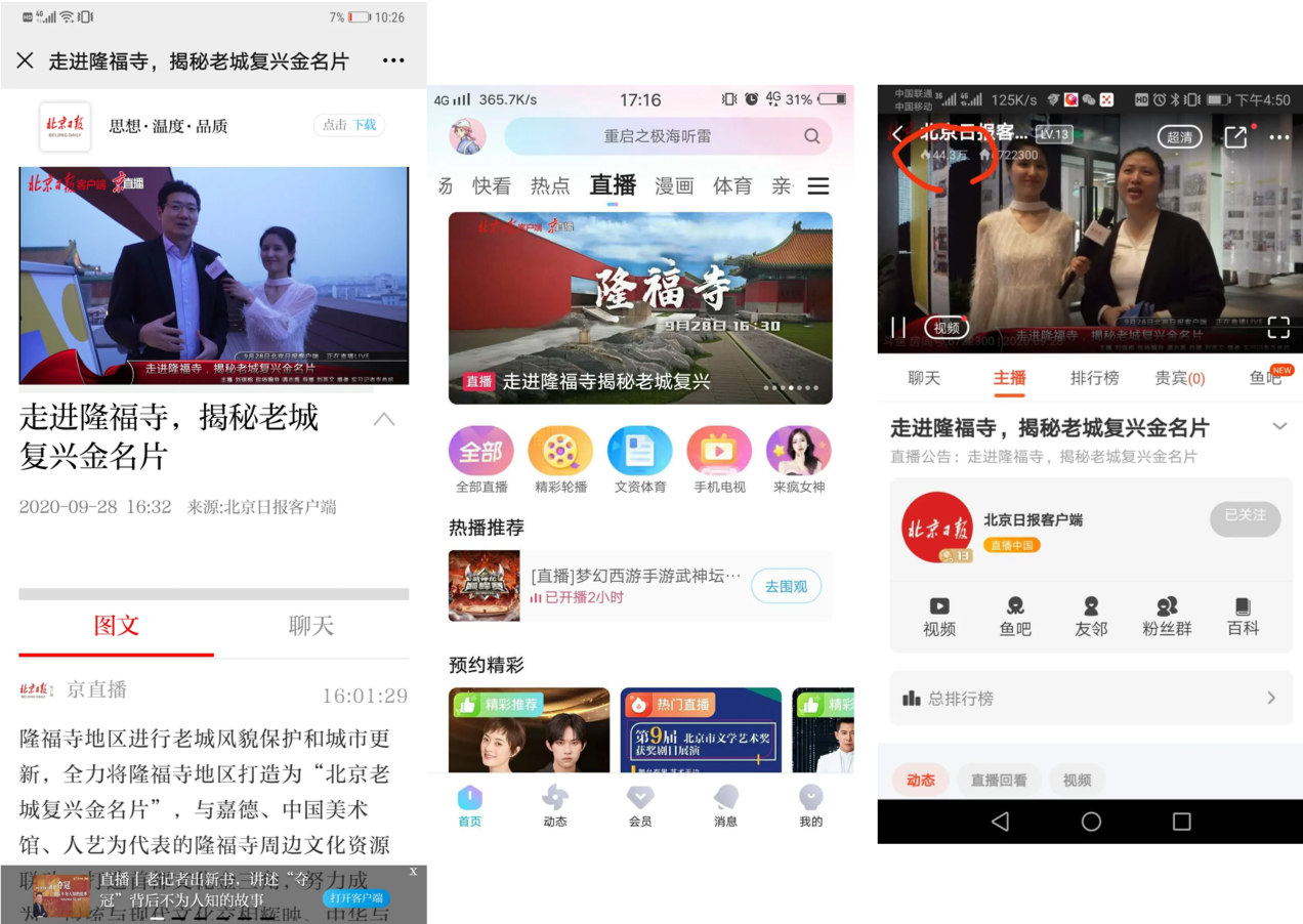 此次直播在北京日報客戶端京直播,北京日報及北京晚報微博直播,北京日報旗下的頭條、百家號、抖音直播、快手直播、斗魚直播,以及聯(lián)合新浪新聞客戶端、優(yōu)酷、長安街知事微博、北京日報百家號、都市現場微博、中搜搜悅、YY直播、KK直播等十余個視頻直播平臺播出,截至目前,總播放量已超過215萬次。直播內容全程“高能”,收獲大批網友的關注和點贊。