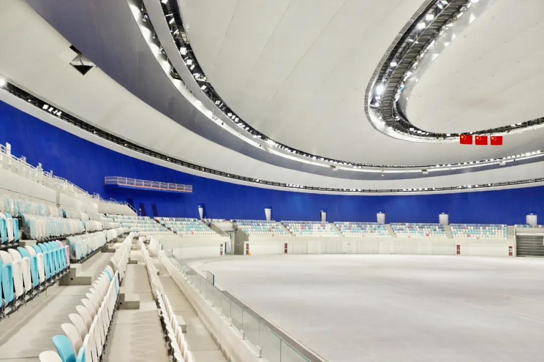 國(guó)家速滑館采用了全冰面設(shè)計(jì),冰面面積1.2萬平方米,是目前亞洲最大冰面,也是全世界最大的采用二氧化碳跨臨界直冷制冷系統(tǒng)的冰面、全球首個(gè)采用二氧化碳跨臨界制冷的冬奧場(chǎng)館。這項(xiàng)技術(shù)是目前世界上最環(huán)保的制冰技術(shù),碳排放趨近于零,同時(shí)也是最先進(jìn)的制冰技術(shù),冰面溫差可控制在0.5度以內(nèi)。這樣制冷不僅比傳統(tǒng)方式效能提升20%以上,且制冷均勻,不會(huì)出現(xiàn)各部位溫度不同的情況,特別是在以0.001秒計(jì)時(shí)的高水平競(jìng)技中,這些都是關(guān)鍵性的因素。同時(shí),國(guó)家速滑館將制冷產(chǎn)生的余熱用于運(yùn)動(dòng)員生活熱水、融冰池融冰、冰面維護(hù)澆冰等,一年可節(jié)省約200萬度電。