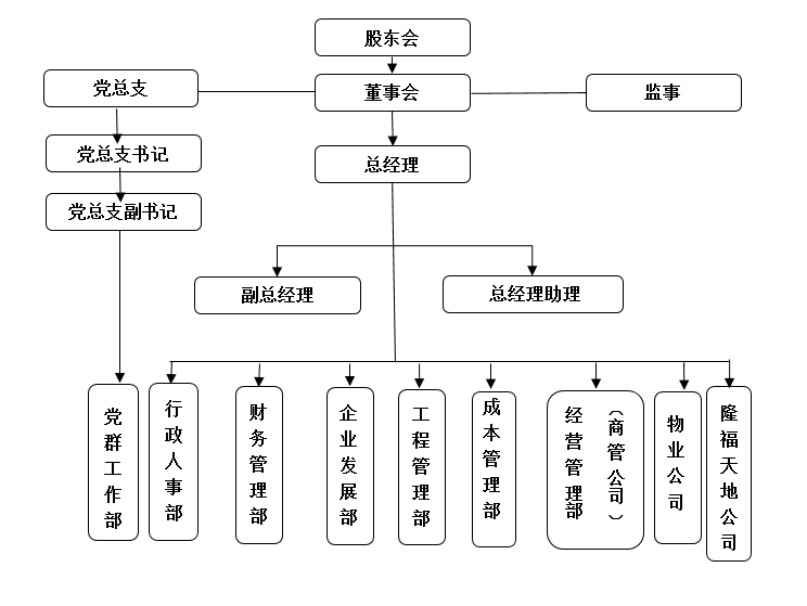 新隆福公司下設(shè)7個部門,分別為黨群工作部、行政人事部、財務(wù)管理部、企業(yè)發(fā)展部、工程管理部、成本管理部及經(jīng)營管理部;下設(shè)3子公司,分別為隆福物業(yè)公司、隆福商管公司、隆福天地公司,其中經(jīng)營管理部與隆福商管公司合署辦公。