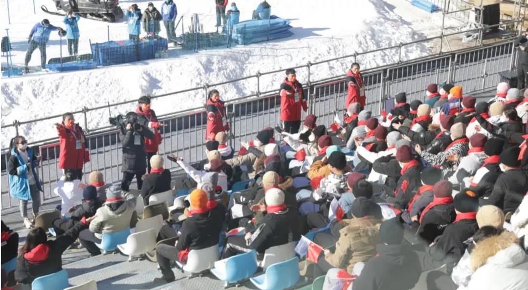 雪上項(xiàng)目的體育展示工作與冰上項(xiàng)目完全不同。脫離燈光、投影等硬件設(shè)施和科技元素的配合,如何詮釋雪上運(yùn)動(dòng)的魅力與激情,在寒冷環(huán)境中調(diào)動(dòng)觀眾觀賽的熱情是體育展示工作的難點(diǎn)。為此,體育展示團(tuán)隊(duì)結(jié)合賽事特點(diǎn),精心設(shè)計(jì)編排了一系列現(xiàn)場互動(dòng)環(huán)節(jié):MC在比賽間隙帶領(lǐng) 300 多名觀眾和志愿者,現(xiàn)場教學(xué)冬奧主題口號(hào)推廣歌曲《一起向未來》的手勢舞;場地志愿者引領(lǐng)觀眾揮動(dòng)手中的旗幟制造“人浪”;體育展示DJ播放拍手歌,引導(dǎo)觀眾“齊舞” ,點(diǎn)燃現(xiàn)場氣氛。在體育展示團(tuán)隊(duì)的引領(lǐng)下,現(xiàn)場觀眾始終情緒高漲,真正融入到比賽中,享受比賽帶來的快樂。