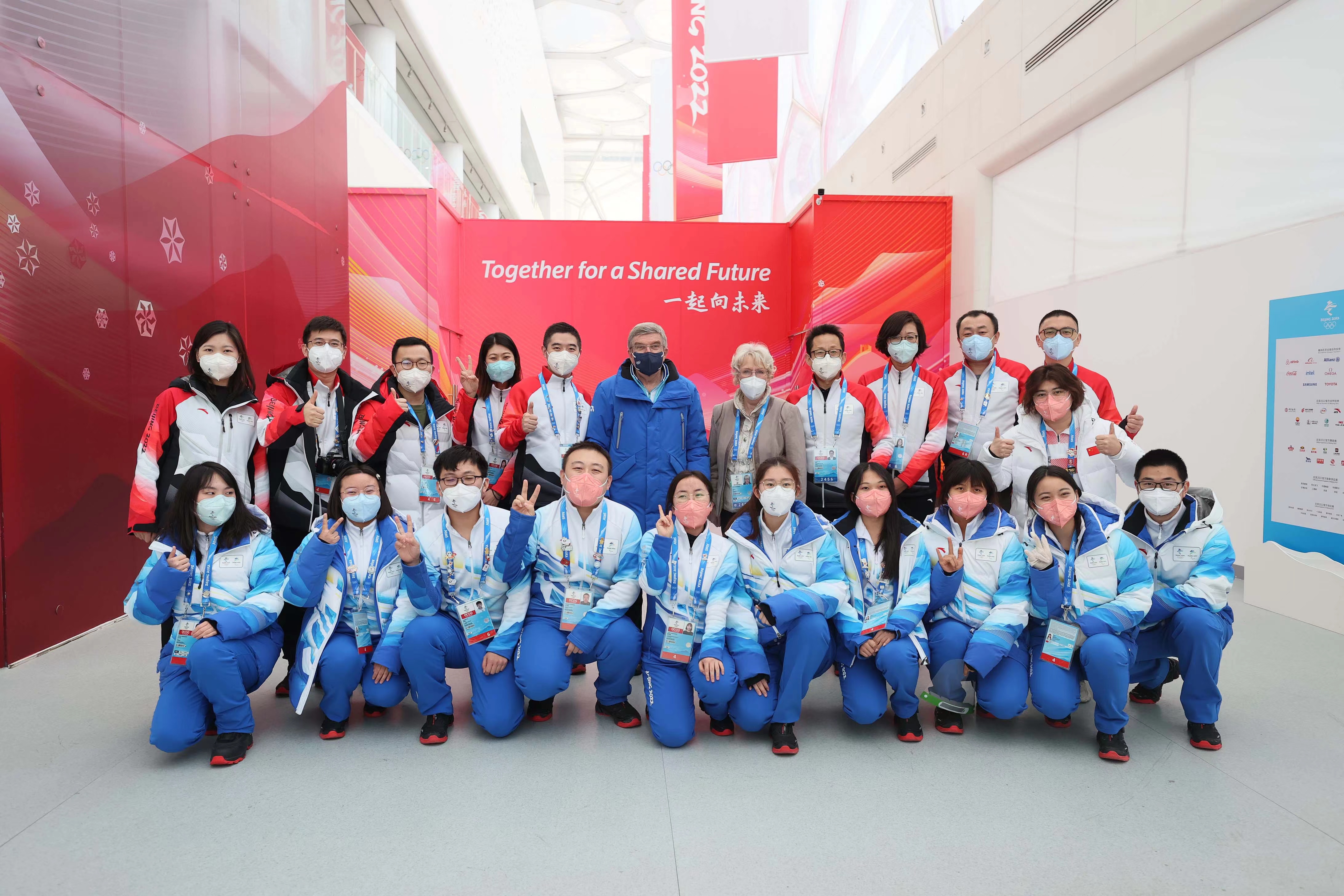 圖說:國際奧委會主席托馬斯·巴赫、世界壺聯(lián)主席凱特·凱斯尼斯與國家游泳中心場館運行團隊工作人員合影