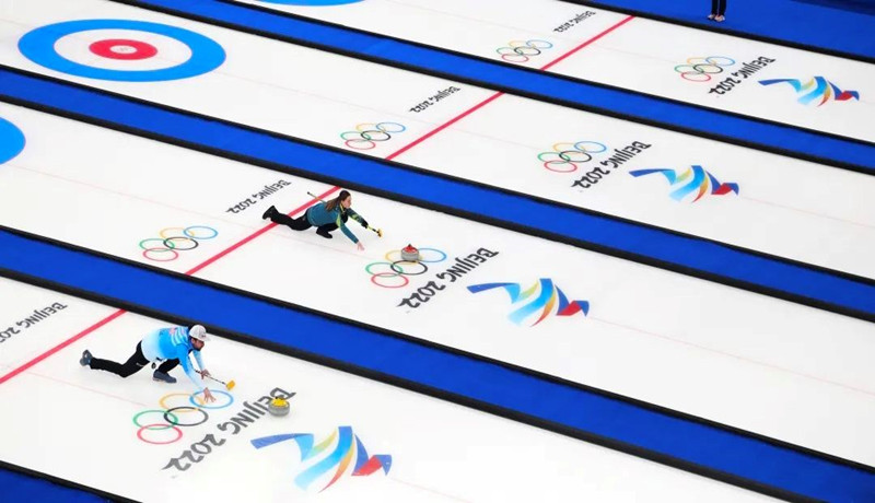 北京2022年冬奧會冰壺混合雙人比賽進行中