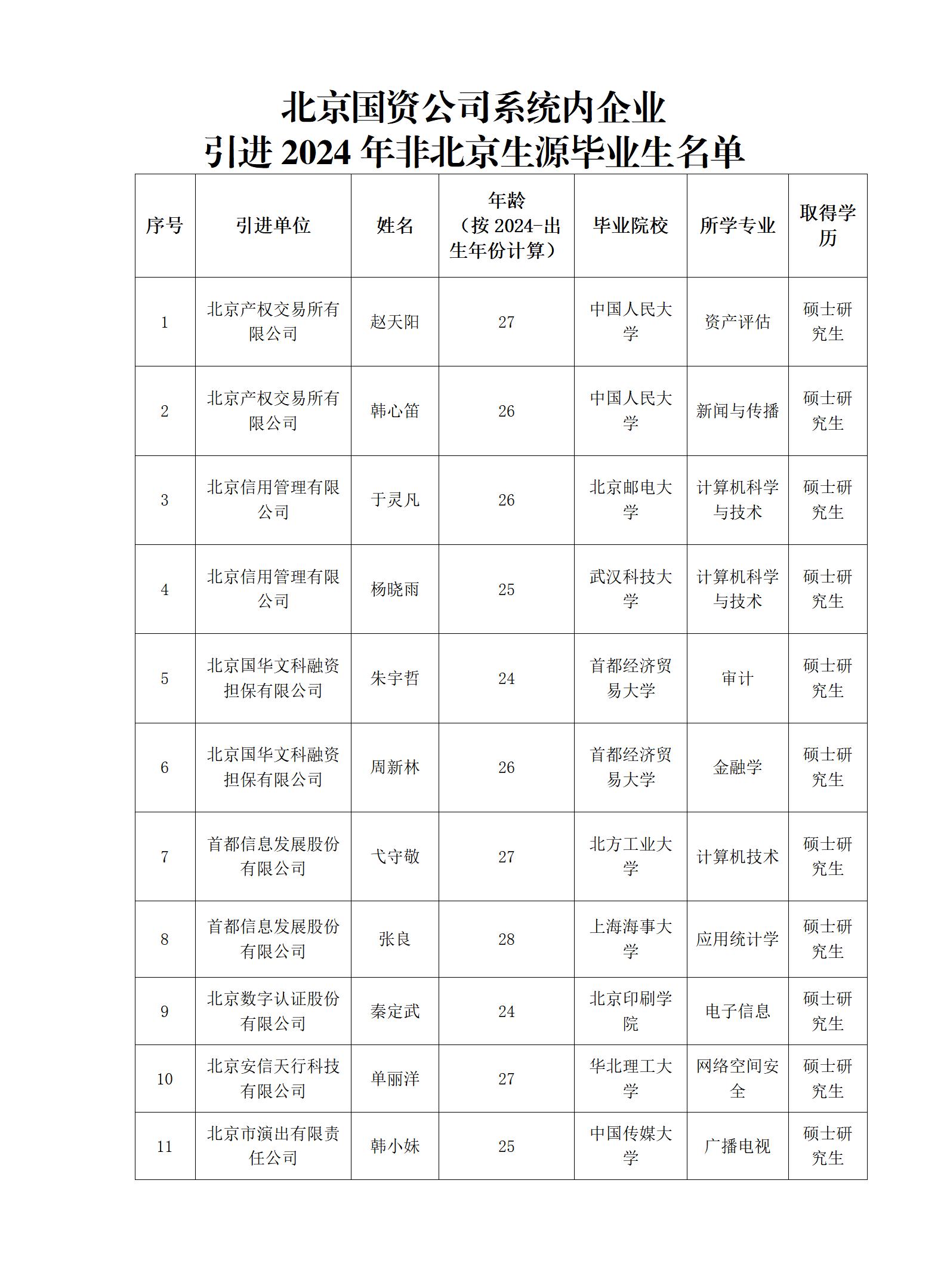 北京國資公司系統(tǒng)內(nèi)企業(yè)引進(jìn)2024年非北京生源畢業(yè)生的公示