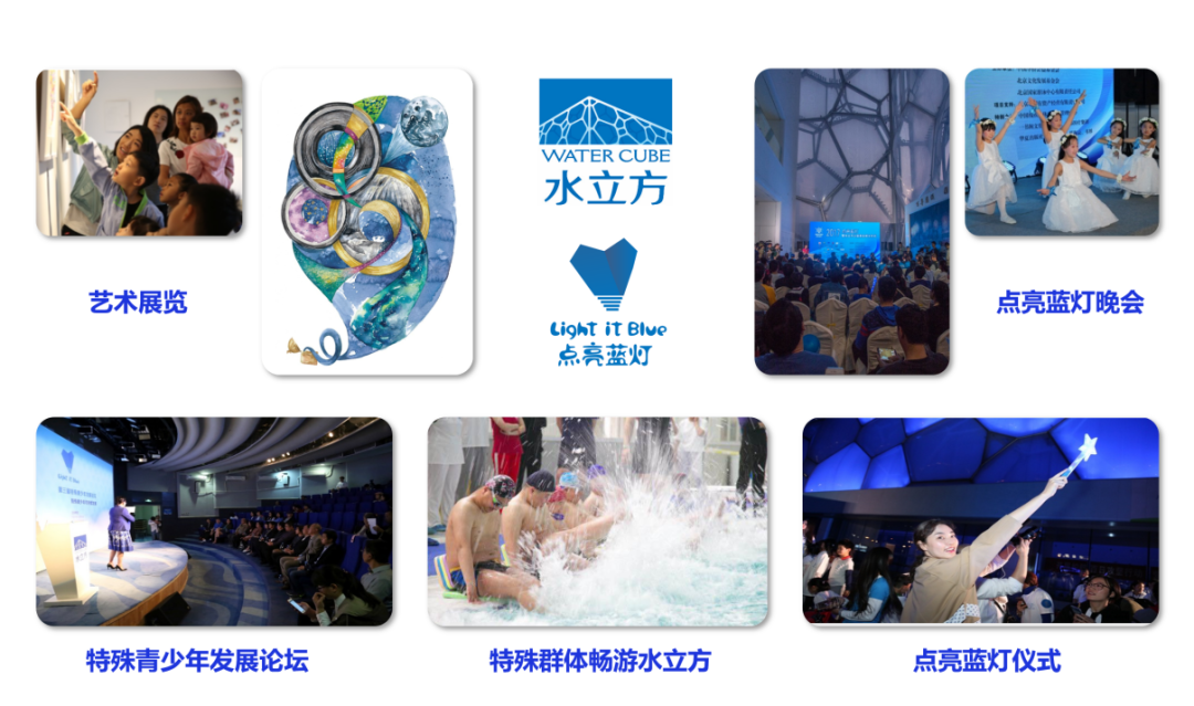 水立方自2011年起開始致力于倡導(dǎo)對自閉癥譜系障礙群體的關(guān)愛活動。十年來,水立方通過每年在4月2日這一天“點亮藍燈”持續(xù)為自閉癥譜系障礙群體發(fā)聲,與專業(yè)機構(gòu)協(xié)作,通過發(fā)起特殊青少年發(fā)展論壇、開放公益參觀游覽、舉辦特殊兒童藝術(shù)展覽、開展對特殊群體的公益游泳培訓(xùn)等多種線下活動,用實際行動表達對自閉癥譜系障礙群體的關(guān)愛,并提供切實可行的幫助。